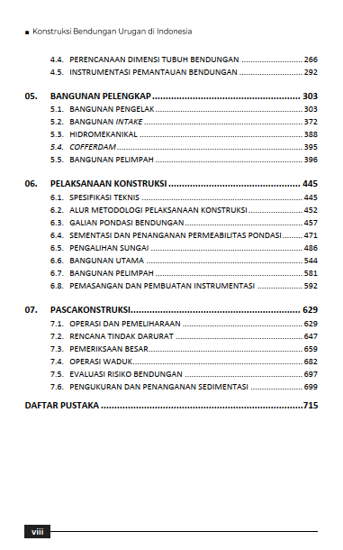 Buku Konstruksi Bendungan Urugan di Indonesia menyajikan pembahasan komprehensif mengenai konsep, desain, dan pelaksanaan pembangunan bendungan urugan yang menjadi salah satu elemen vital dalam infrastruktur sumber daya air nasional. Bendungan urugan merupakan struktur penahan air yang dibangun dari material alami seperti tanah, batu, atau campuran keduanya, yang dipadatkan secara berlapis untuk mencapai stabilitas dan kekuatan yang optimal. Jenis bendungan ini banyak digunakan di Indonesia karena menyesuaikan dengan kondisi geoteknik dan ketersediaan material lokal. Buku ini tidak hanya menjadi referensi penting bagi insinyur sipil, perencana, dan mahasiswa teknik, tetapi juga memberikan wawasan bagi pembuat kebijakan tentang pentingnya penerapan konstruksi berkelanjutan dalam pembangunan infrastruktur air nasional.