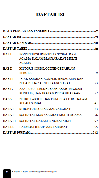 Buku ini mengulas tentang konstruksi sosial dalam masyarakat multiagama. Lingkungan sosial yang didiami oleh individu dan kelompok sosial dalam jangka waktu cukup lama, memungkinkan adanya proses interaksi sosial sehingga warganya saling mengenal. Di dalamnya berlangsung proses pembentukan karakter seseorang maupun sekelompok orang, termasuk karakter yang berhubungan dengan emosi keagamaan. Karakter keagamaan seseorang maupun sekelompok orang yang berkaitan dengan perasaan-perasaan dan hasratnya, nyata dalam sikap dan perilaku dalam pergaulan hidup bermasyarakat. Dalam mengetahui karakter beragama dari seseorang maupun sekelompok orang, harus memahami sikap dan perilakunya antar sesama penganut agama, maupun penganut agama yang berbeda dalam lingkungan sosial sebagai tempat berlangsungnya interaksi sosial. Pandangan seseorang maupun sekelompok orang tentang agamanya dan agama yang dianut orang lain, dapat ditemui pada berbagai fenomena sosial karena konsep berpikir yang cenderung mengklaim bahwa kebenaran absolut hanya ada pada kelompok sendiri, dan di luar itu seolah tidak ada keselamatan. Pandangan seperti ini cenderung mengarah pada karakteristik penganut agama dalam membentuk identitas, sesuai agama yang dianut oleh masing-masing.