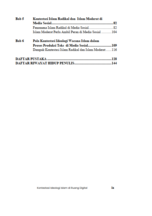 Buku ini mengajak pembaca melihat bagaimana ideologi keagamaan hari ini bertemu, berbenturan, dan saling berebut makna di media sosial. Islam Moderat dan Islam Radikal tidak hanya bertarung soal dalil dan tafsir, tetapi juga soal siapa yang berhak berbicara atas nama “Islam” itu sendiri. Media sosial, website, dan berbagai platform digital menjadi panggung tempat narasi dibangun, dukungan dikumpulkan, dan pengaruh dibentuk. Melalui contoh-contoh wacana, pola komunikasi, dan respons publik, buku ini memperlihatkan bagaimana kontestasi kadang membuka ruang bagi pengetahuan dan percakapan yang lebih luas, namun di sisi lain lebih sering memunculkan polarisasi, kebisingan, dan ketegangan. Tidak ada penghakiman dalam buku ini, tetapi lebih ke pemahaman: bagaimana ideologi bekerja, bagaimana ia memikat, bagaimana ia mewarnai cara orang memandang dirinya, orang lain, dan dunia. Pertaruhan bukan hanya berlaku pada wacana keagamaan, tetapi juga cara kita hidup bersama dalam keberagaman.
