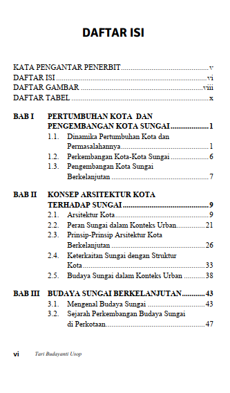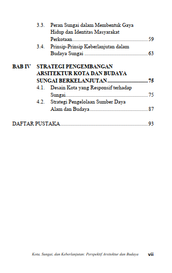 Buku berjudul Keberlanjutan Kota dan Sungai: Perspektif Arsitektur dan Budaya ini tersusun atas empat bab, dengan pokok bahasan meliputi pertumbuhan kota dan pengembangan kota sungai, konsep arsitektur kota terhadap sungai, budaya sungai berkelanjutan, hingga strategi pengembangan arsitektur kota dan budaya sungai berkelanjutan. Buku ini diharapkan dapat menjadi sumber referensi yang bermanfaat tidak hanya bagi pembaca dari bidang keahlian arsitektur, namun juga pembaca dari bidang keilmuan lainnya yang tertarik pada topik pembangunan kota dan pelestarian sungai. Selamat membaca!