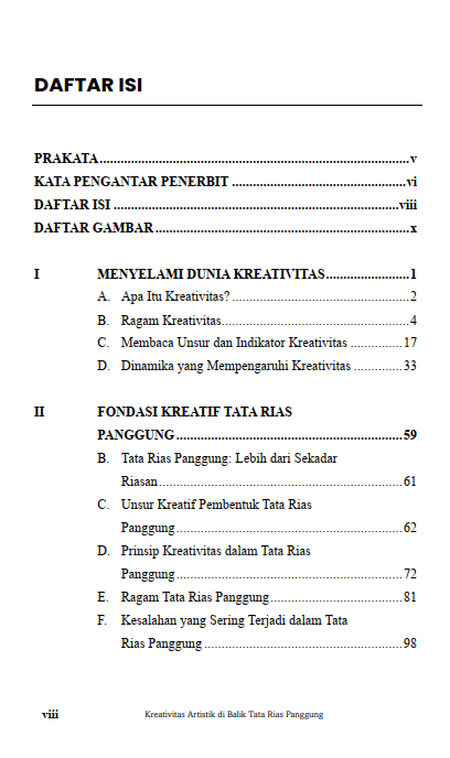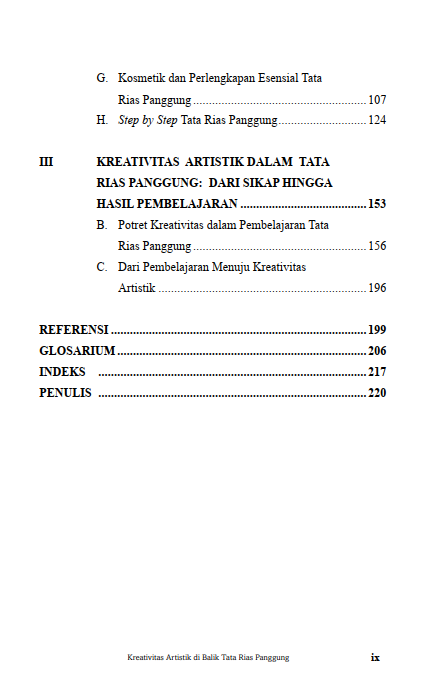 Dalam buku ini, pembaca akan diajak memahami prinsip dasar tata rias panggung, mulai dari pemilihan warna, teknik pengaplikasian riasan, hingga penggunaan prostetik dan efek khusus. Penulis juga mengeksplorasi hubungan erat antara tata rias dengan pencahayaan dan kostum, karena setiap elemen harus berpadu harmonis untuk menciptakan kesan yang kuat di hadapan penonton. Tata rias panggung memiliki peran yang sangat relevan dalam kehidupan modern, terutama di dunia hiburan, film, televisi, hingga acara seni tradisional. Profesi penata rias kini tidak hanya dituntut untuk memiliki keterampilan teknis, tetapi juga pemahaman mendalam tentang seni, psikologi karakter, dan tren visual.