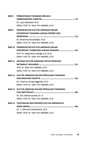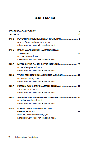 Buku berjudul Kultur Jaringan Tumbuhanini terbagi ke dalam lima belas bab, dengan cakupan materi meliputi pengantar kultur jaringan tumbuhan, dasar-dasar biologi sel dan jaringan tumbuhan, media kultur dalam kultur jaringan, teknik sterilisasi dalam kultur jaringan, serta eksplan dan sumber material tanaman. Pada bab-bab berikutnya diulas mengenai jenis-jenis kultur jaringan tumbuhan, perbanyakan tanaman melalui organogenesis, perbanyakan tanaman melalui embriogenesis somatik, pemanfaatan kultur jaringan dalam konservasi tanaman jangka pendek dan menengah, hingga pemanfaatan kultur jaringan dalam konservasi tumbuhan jangka panjang. Bab-bab terakhir dalam buku ini menyoroti pemanfaatan kultur jaringan, seperti aplikasi kultur jaringan untuk produksi metabolit sekunder, kultur jaringan dalam pemuliaan tanaman dan rekayasa genetik, kultur jaringan dalam pemuliaan tanaman (fusi protoplas). Buku ini ditutup dengan pemaparan tantangan dan prospek kultur jaringan di masa depan serta inovasi dan teknologi terbaru dalam kultur jaringan.