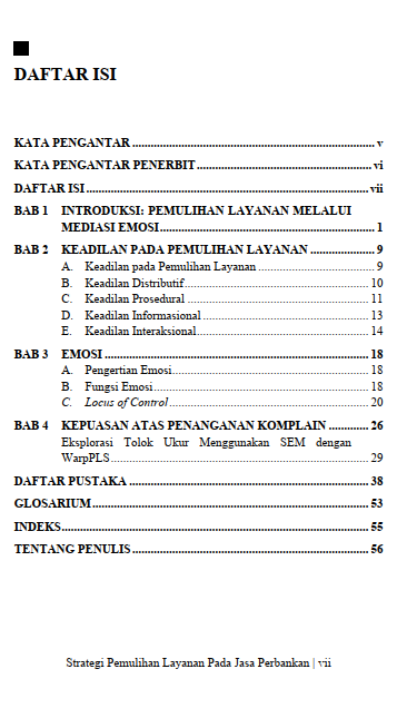 Buku berjudul Locus of Control: Mediasi Emosi untuk Menangani Keluhan Pelanggan ini disusun sebagai bahan acuan bagi perusahaan perbankan khususnya bank perekonomian dalam membangun, memelihara dan mempertahankan hubungan jangka panjang dalam meningkatkan kepuasan penanganan keluhan. Terdiri atas empat bab, materi dalam buku ini mencakup introduksi mengenai pemulihan layanan melalui mediasi emosi, keadilan pada pemulihan layanan, pengantar khusus mengenai emosi, hingga kepuasan penanganan komplain. Buku ini diharapkan dapat mengembangkan khazanah ilmu Manajemen Pemasaran Perilaku Konsumen. Selamat membaca!