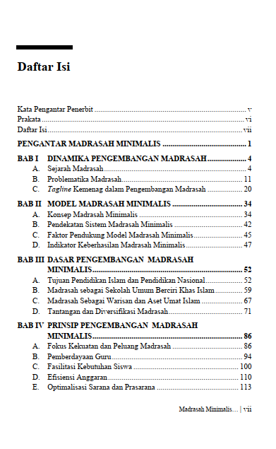Buku ini mengulas tentang madrasah minimalis sebagai alternatif baru dari pengembangan program-program madrasah yang ada. Konsep madrasah minimalis menekankan pada pengembangan berbasis potensi internal, terutama potensi guru serta kebutuhan siswa. Madrasah minimalis tidak bergantung pada kelengkapan fasilitas atau anggaran besar, melainkan bertumpu pada kekuatan sumber daya yang tersedia dan kesadaran akan esensi pendidikan Islam. Madrasah tidak harus seragam dalam bentuk dan ukuran, tetapi harus bermakna dalam peran dan berdampak dalam pengaruhnya.