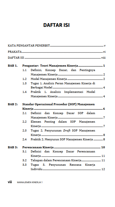 Buku Manajemen Kinerja 1 ini disusun untuk memberikan pemahaman yang komprehensif kepada mahasiswa mengenai konsep, teori, serta aplikasi manajemen kinerja yang relevan dengan kebutuhan organisasi modern. Buku ini terdiri atas 14 bab yang mencakup berbagai aspek penting manajemen kinerja, mulai dari teori dasar, penyusunan indikator kinerja, hingga strategi bisnis dan Balanced Scorecard. Setiap bab disusun secara sistematis dengan tambahan tugas dan praktik untuk mendukung pembelajaran secara aktif dan aplikatif. Dengan ini, mahasiswa tidak hanya memahami teori, tetapi juga mampu mengaplikasikannya dalam kasus nyata. Semoga buku ini dapat menjadi sumber belajar yang bermanfaat bagi mahasiswa, dosen, dan pembaca lainnya, serta berkontribusi pada pengembangan ilmu manajemen sumber daya manusia di Indonesia. Selamat membaca!