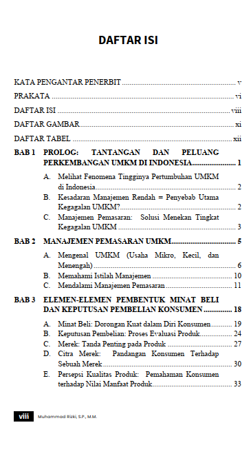 Buku ini mengupas tuntas berbagai elemen penting dalam manajemen pemasaran, mulai dari membangun citra merek yang kuat, meningkatkan persepsi kualitas produk, hingga strategi memengaruhi minat beli dan keputusan pembelian. Selain itu, buku ini juga menguraikan hubungan setiap elemen dalam mewujudkan UMKM yang berkelanjutan. Buku ini diharapkan dapat menjadi sumber referensi bagi para pelaku UMKM agar lebih siap bersaing di pasar yang dinamis dan meningkatkan daya saing produk sampai terwujudnya usaha yang berkelanjutan.