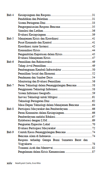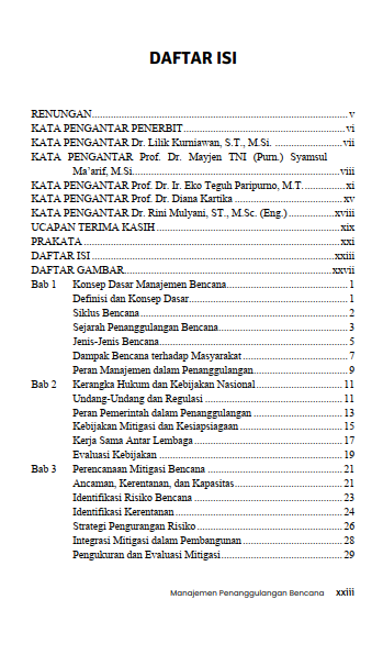 Buku ini menyajikan uraian mendalam mengenai manajemen penanggulangan bencana. Konsep dasar penanggulangan bencana melibatkan beberapa elemen kunci yang saling terkait. Pertama adalah pemahaman tentang risiko bencana, yang mencakup identifikasi dan analisis potensi ancaman serta kerentanan yang ada. Selanjutnya, manajemen risiko bencana menjadi inti dari penanggulangan bencana. Manajemen risiko melibatkan proses sistematis untuk mengidentifikasi, menilai, dan mengurangi risiko, serta menyiapkan masyarakat untuk menghadapi bencana. Hal ini mencakup pengembangan kebijakan dan strategi yang efektif, peningkatan kapasitas kelembagaan dan sumber daya manusia, serta penerapan teknologi dan inovasi untuk mendukung upaya penanggulangan bencana.