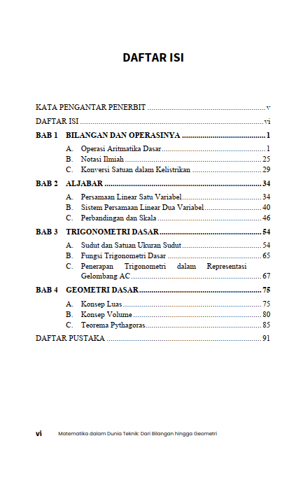 Isi buku ini mencakup empat bagian utama, yaitu Bilangan dan Operasinya, Aljabar, Trigonometri Dasar, dan Geometri Dasar. Bab Bilangan dan Operasinya membahas konsep dasar aritmetika dan penerapannya dalam pengukuran teknik. Bagian Aljabar memperkenalkan cara memodelkan permasalahan teknik melalui persamaan dan fungsi. Trigonometri Dasar menguraikan hubungan sudut dan panjang yang penting dalam pengukuran dan perancangan bangunan maupun mesin. Sementara Geometri Dasar menjelaskan bentuk, ukuran, dan ruang yang menjadi dasar dalam gambar teknik serta desain mekanik.