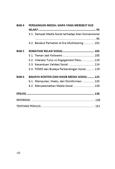 Makna pertemanan yang tulus perlahan tergerus saat teman hanya dianggap sebagai angka pengikut. Interaksi hangat yang dulu dirasakan berubah menjadi sekadar pengejaran angka keterlibatan semu dan kecanduan validasi sosial. Perasaan takut tertinggal atau FOMO dipelihara oleh budaya pamer yang memicu perbandingan sosial tiada henti. Lebih jauh lagi, bahaya manipulasi informasi dan penyebaran kabar bohong dibiarkan merajalela, mengancam kejernihan berpikir penggunanya. Nasib media sosial yang kini berada di persimpangan jalan dipertanyakan kembali di tengah gempuran konten berbahaya tersebut. Sebuah perenungan mendalam mengenai matinya relasi sosial yang autentik dan upaya penyelamatan ruang digital kita disajikan sebagai penutup yang menggugah kesadaran dalam buku ini.