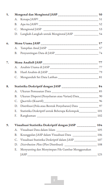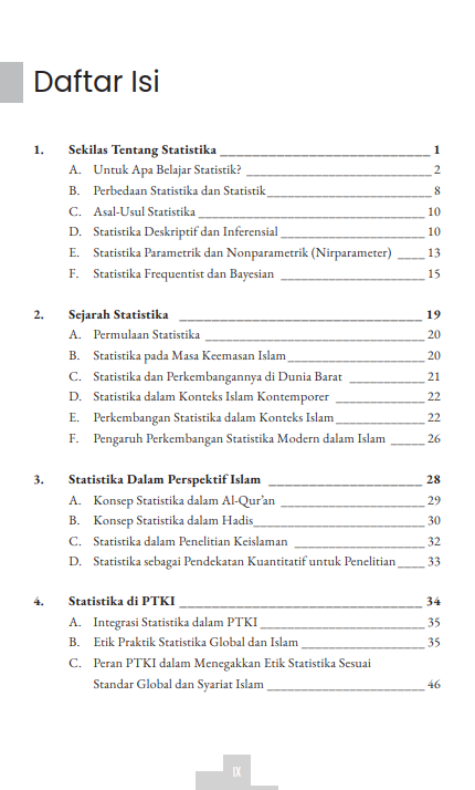 Semoga buku ini dapat memperluas cakrawala keilmuan dan menjadi rujukan utama dalam pembelajaran statistika di PTKI dan lembaga pendidikan Islam lainnya. Selamat membaca!