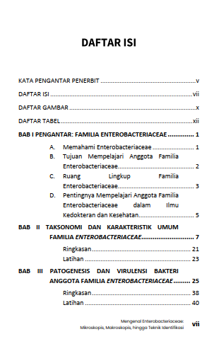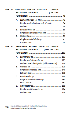 Buku berjudul Mengenal Enterobacteriaceae: Mikroskopis, Makroskopis, hingga Teknik Identifikasi terdiri dari beberapa bab yang membahas mengenai Enterobacteriaceae. Pertama, pengantar familia Enterobacteriaceae. Kedua, taksonomi dan karakteristik umum familia Enterobacteriaceae. Ketiga, patogenesis dan virulensi bakteri anggota familia Enterobacteriaceae. Keempat, jenis-jenis bakteri anggota familia Enterobacteriaceae (laktosa fermenter). Kelima, jenis-jenis bakteri anggota Enterobacteriaceae (nonlaktosa fermenter). Dan terakhir berisi soal-soal beserta jawabannya.