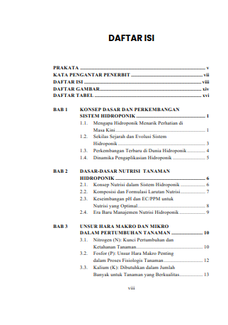 Secara keseluruhan, buku ini dirancang sebagai rujukan yang menjembatani teori dan praktik sehingga bermanfaat bagi mahasiswa, pendidik, peneliti, praktisi hidroponik, maupun pembaca umum yang ingin memahami dan menerapkan peracikan larutan hara secara benar, rasional, dan berbasis ilmu pengetahuan. Buku ini diharapkan dapat mendukung pengembangan hidroponik yang efisien, presisi, dan berkelanjutan.