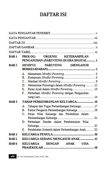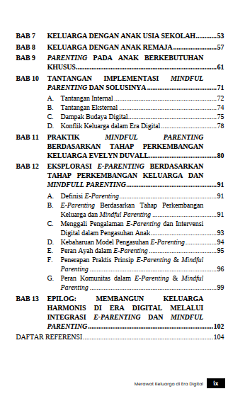 Buku ini juga mengintegrasikan pendekatan e-parenting yang dapat diakses secara digital, dengan tetap mempertahankan nilai kehangatan, kedekatan emosional, dan empati dalam relasi orang tua-anak. Pembaca tidak hanya akan menemukan tantangan implementasi mindful parenting dalam praktik, tetapi juga solusi nyata dan inspiratif. Melalui sinergi antara perkembangan keluarga dan pendekatan pengasuhan berkesadaran, buku ini menjadi teman reflektif dan praktis bagi para orang tua yang ingin menumbuhkan keluarga yang kuat, harmonis, dan adaptif di tengah dunia yang terus berubah.