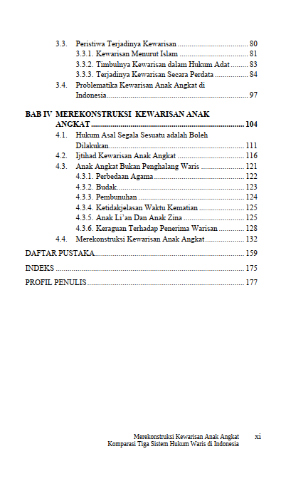 Buku Merekonstruksi Kewarisan Anak Angkat (Komparasi Tiga Sistem Hukum Waris di Indonesia)membahas mengenai ilmu waris anak angkat, meliputi pewarisan (mawaris), yaitu pembagian harta peninggalan (tirkah) secara adil sesuai syariat Islam. Terbagi ke dalam empat bab, buku ini mengulas mulai dari hukum pengangkatan anak, anak angkat dalam tiga sistem hukum, problematika kewarisan anak angkat, hingga merekonstruksi kewarisan anak angkat. Semoga buku ini bermanfaat sebagai referensi di bidang ilmu hukum, khususnya ilmu hukum waris. Selamat membaca!