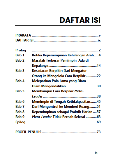 Melalui refleksi yang jujur, kisah-kisah yang dekat dengan kehidupan nyata, dan pertanyaan yang menggugah, buku ini memperkenalkan konsep Meta-Leader: pemimpin yang tidak sibuk mengontrol orang, tetapi membangun kejernihan berpikir; pemimpin yang mampu hadir, tenang, dan matang di tengah ketidakpastian.