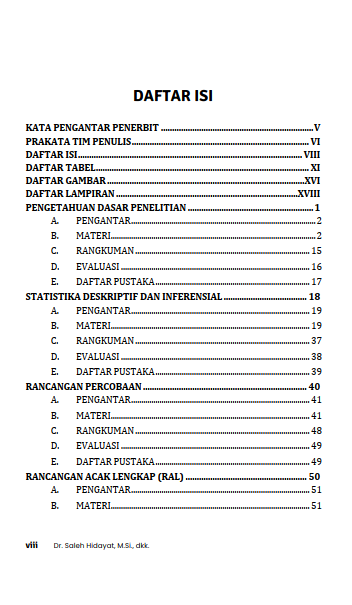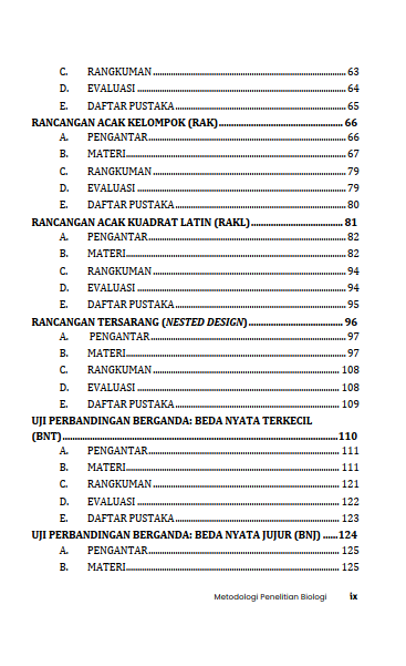 Buku Metodologi Penelitian Biologi menguraikan hal-hal yang diperlukan dalam sebuah penelitian. Di dalam buku ini mencakup pengetahuan dasar penelitian, statistika deskriptif dan inferensial, rancangan percobaan yang meliputi; Rancangan Acak Lengkap (RAL); Rancangan Acak Kelompok (RAK); Rancangan Acak Kuadrat Latin (RAKL); Rancangan Tersarang (nested design). Selain itu, terdapat juga uji perbandingan berganda: Beda Nyata Terkecil (BNT), Beda Nyata Jujur (BNJ), Uji Wilayah Berganda Duncan (WBD), serta Rancangan Faktorial. Buku ini tidak hanya memuat teori-teori, tetapi juga berisi contoh penerapan, penghitungan, serta berisi tabel-tabel dari tiap-tiap teknik uji.
