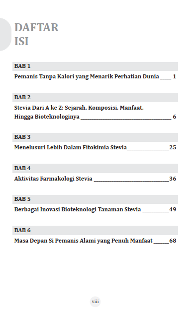 Keajaiban Stevia tidak berhenti pada rasa manisnya yang nol kalori. Buku ini menggali lebih dalam potensi kesehatannya yang menakjubkan. Serta memahami perannya sebagai zat yang membantu penderita diabetes, kemampuannya dalam membantu mengendalikan hipertensi, serta kekuatannya sebagai antioksidan. Dengan didukung oleh temuan-temuan klinis terbaru, mengulas keamanannya, dan membandingkannya dengan pemanis buatan atau alami lainnya, buku ini berisikan materi yang berbobot. Serta melihat ke masa depan: bagaimana bioteknologi, seperti kultur jaringan dan rekayasa genetik, bekerja untuk menciptakan varietas Stevia yang lebih unggul. Ini adalah pandangan utuh tentang bagaimana Stevia dimanfaatkan dalam industri makanan, minuman, dan farmasi.