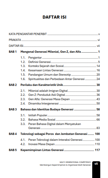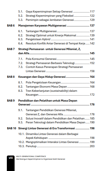 Buku ini hadir sebagai bacaan praktis untuk mengelola tim multigenerasi secara efektif. Anda dapat menemukan berbagai strategi untuk mengatasi kesenjangan komunikasi, memanfaatkan teknologi secara optimal, serta membangun budaya kerja yang inklusif dan kolaboratif. Cocok untuk para pemimpin, praktisi HRD, pendidik, mahasiswa, serta siapa saja yang ingin mengoptimalkan potensi dari setiap generasi di era digital.