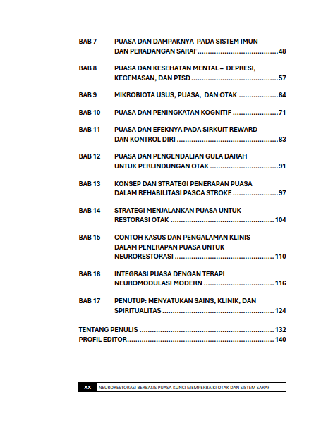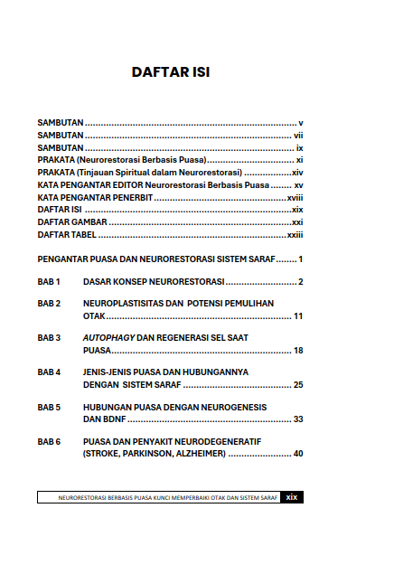 Buku Neurorestorasi Berbasis Puasa: Kunci Memperbaiki Otak dan Sistem Saraf mengupas peran puasa sebagai strategi alami untuk merangsang pemulihan dan perlindungan jaringan saraf. Dengan uraian mendalam yang mudah dipahami, buku ini menjelaskan bagaimana puasa memicu proses neuroplastisitas, autofagi, dan keseimbangan metabolik yang penting bagi kesehatan otak. Pembaca diajak memahami kaitan antara pola makan, fungsi kognitif, serta pencegahan gangguan neurologis, sekaligus memperoleh panduan praktis menerapkan puasa secara aman dan berkelanjutan. Buku ini relevan bagi mahasiswa, praktisi kesehatan, dan masyarakat umum yang ingin menjaga kesehatan otak secara holistik.