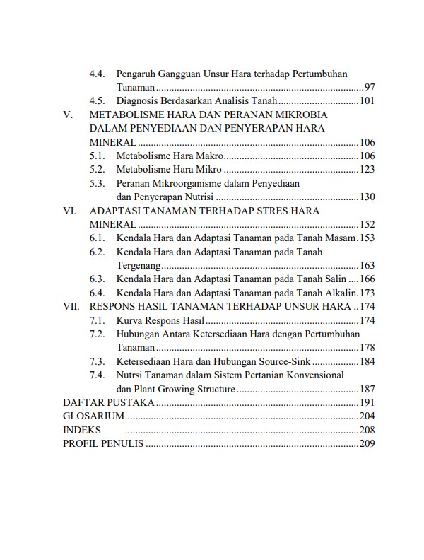 Nutrisi tanaman yang sering disebut dengan unsur hara atau hara mineral adalah makanan bagi tanaman dan secara umum dikelompokkan menjadi hara makro dan mikro berdasarkan jumlah yang dibutuhkan oleh tanaman. Oleh karena sebagai makanan, maka tanaman harus mendapatkan nutrisi dalam jenis, jumlah dan waktu yang tepat agar dapat tumbuh sehat dan berproduksi dengan baik. Perkembangan ilmu dan teknologi nutrisi tanaman sangat pesat dengan ditemukannya sumber unsur hara berupa pupuk mikrobiologis, pupuk hayati/biofertilizer, pupuk probiotik, pupuk nano, dan lain-lain. Namun demikian, ilmu dan teknologi nutrisi tanaman tradisional tetap tidak ditinggalkan, malah semakin dikembangkan agar penambahan asupan nutrisi dalam budidaya tanaman dapat menjamin tetap lestarinya lingkungan (conserving while using) atau tidak menyebabkan terdegradasinya lahan-lahan pertanian (degrading while using). Dengan demikian pengetahuan tentang nutrisi tanaman menjadi semakin penting dengan semakin majunya perkembangan teknologi pertanian, terlebih berbagai jenis asupan nutrisi tanaman saat ini tidak hanya berfungsi sebagai sumber unsur hara (biofertilizer) tetapi juga sebagai biostimulan dan bioprotektan. Diharapkan dengan membaca buku ini dapat memberikan pemahaman teoritis dan praktis mengenai jenis-jenis, klaisifikasi, fungsi dan kebutuhan unsur hara bagi tanaman, pergerakan hara mineral ke tanaman dan dalam tanaman, diagnosis defisiensi dan toksisitas tanaman terhadap hara mineral, metabolisme hara makro dan mikro, peranan mikrobia dalam penyediaan dan penyerapan hara mineral, adaptasi tanaman pada berbagai jenis tanah dengan keterbatasan hara mineral, dan kurva respon hasil tanaman terhadap hara mineral. Buku ini akan sangat bermanfaat bagi mahasiswa pertanian dari semua program studi serta masyarakat umum yang tertarik mengembangkan dan mempraktekkan nutrisi tanaman untuk meningkatkan produktivitas lahan dan hasil pertanian, meningkatkan pendapatan, dan mempertahankan kelestarian lingkungan secara berkelanjutan.
