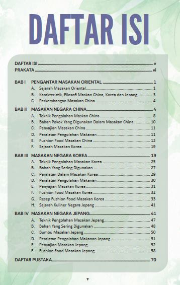Buku ini dirancang sebagai panduan pembelajaran bagi siswa yang ingin memahami dan mengembangkan kemampuan memasak masakan oriental dengan pendekatan fusion food, sebuah tren kuliner yang menggabungkan berbagai elemen budaya untuk menciptakan hidangan baru yang unik dan kreatif. Buku ini disusun secara sistematis untuk memberikan pemahaman teori dan keterampilan praktis. Materi yang disajikan mencakup konsep dasar masakan oriental, prinsip fusion food, teknik memasak, hingga inovasi dalam menciptakan resep.