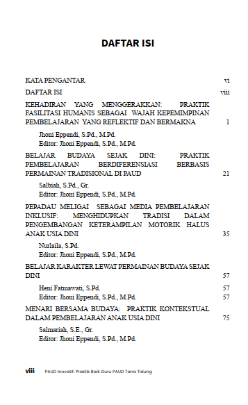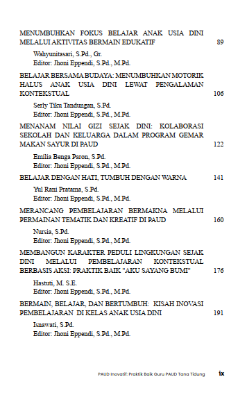 Buku “PAUD Inovatif: Praktik Baik Guru PAUD Tana Tidung” ini memuat berbagai jenis inovasi dalam pendidikan anak usia dini yang diinisiasi oleh para pendidik. Contoh inovasi yang telah dipraktikkan oleh para pendidik, sebagai berikut: memadukan pembelajaran berbasis budaya dan permainan tradisional; pengenalan berbagai jenis sayuran dengan kegiatan menanam, memasak, mencicipi, merasa serta kegiatan bermain peran jual-beli sayuran; pendampingan guru dalam penggunaan teknologi digital; dan masih banyak inovasi lainnya. Pada setiap tulisan menceritakan berbagai perubahan yang lahir dari refleksi, kepedulian, serta keberanian dalam mencoba hal baru. Buku ini disusun dengan harapan dapat menjadi inspirasi bagi para pendidik untuk terus bergerak, berbagi, dan tumbuh bersama demi menghadirkan layanan PAUD yang bermutu dan inklusif.