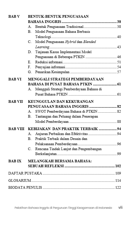 Buku ini hadir sebagai panduan komprehensif yang mengulas secara mendalam tentang peran pemberdayaan bahasa Inggris dalam meningkatkan kemampuan komunikasi internasional, memperluas akses terhadap literatur akademik, serta membuka peluang karier di pasar domestik dan internasional. Ditujukan untuk pengelola pendidikan, dosen, pembuat kebijakan, dan mahasiswa, buku ini menyajikan wawasan tentang berbagai model penguasaan bahasa Inggris yang telah terbukti efektif, dari strategi konvensional hingga pendekatan berbasis teknologi terkini.