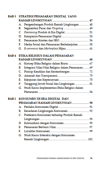 Selain membahas aspek teknis, buku ini juga menekankan pentingnya etika religius dalam pemasaran ramah lingkungan. Nilai-nilai moral seperti kejujuran dan tanggung jawab sosial menjadi dasar dalam pengambilan keputusan bisnis. Dengan mengintegrasikan etika religius, perusahaan dapat memastikan bahwa tindakan pemasaran mereka tidak hanya menguntungkan secara finansial, tetapi juga berdampak positif bagi lingkungan dan masyarakat secara keseluruhan. Buku ini berisi materi yang dapat diterapkan oleh berbagai jenis perusahaan untuk mencapai tujuan keberlanjutan.