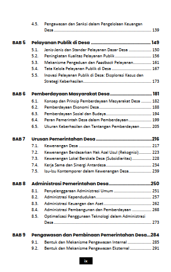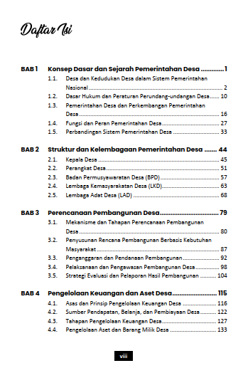 Buku ajar ini menghadirkan pembahasan komprehensif mengenai konsep, regulasi, kelembagaan, serta praktik penyelenggaraan pemerintahan desa secara terstruktur. Pembahasan mencakup dasar filosofis dan historis, tata organisasi, perencanaan dan pengelolaan keuangan, manajemen aset, pelayanan publik, hingga isu-isu aktual seperti pemberdayaan masyarakat, inovasi desa, dan penyelesaian konflik. Kehadiran buku ini diharapkan dapat menjadi rujukan akademik sekaligus panduan praktis dalam mendorong terwujudnya desa yang maju, mandiri, dan sejahtera.