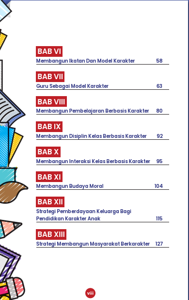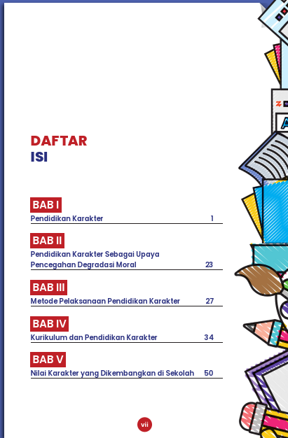 Buku berjudul Pendidikan Karakter ini tersusun atas tiga belas bab, dengan cakupan materi meliputi pengantar mengenai pendidikan karakter, pendidikan karakter sebagai upaya pencegahan degradasi moral, metode pelaksanaan pendidikan karakter, kurikulum dan pendidikan karakter, nilai karakter yang dikembangkan di sekolah, membangun ikatan dan model karakter, guru sebagai model karakter, membangun pembelajaran berbasis karakter, membangun disiplin kelas berbasis karakter, membangun interaksi kelas berbasis karakter, membangun budaya moral, hingga strategi pemberdayaan keluarga bagi pendidikan karakter anak. Semoga buku ini bermanfaat sebagai tambahan wawasan keilmuan di bidang pendidikan. Selamat membaca!