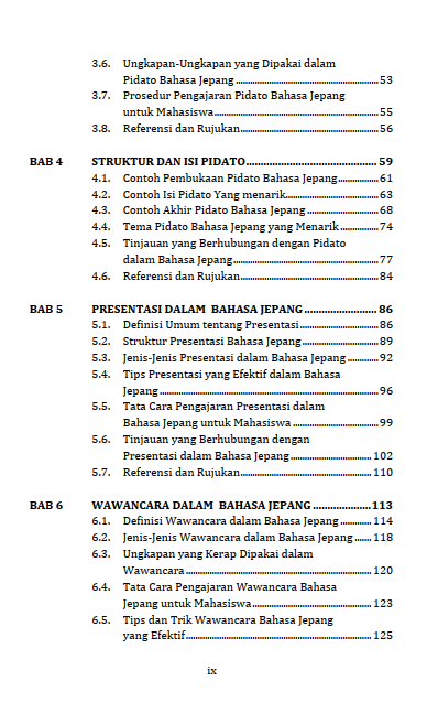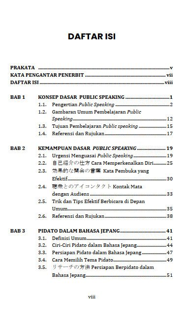Buku berjudul “Pengajaran Public Speaking Bahasa Jepang” ini disusun secara sistematis dan komprehensif yang dirancang untuk memberikan pemahaman yang mendalam mengenai berbagai macam aspek public speaking. Aspek tersebut meliputi persiapan materi, penggunaan bahasa tubuh, hingga cara mengatasi kecemasan dan membangun kepercayaan diri. Tidak hanya itu, di dalam buku ini juga terdapat berbagai bentuk pengajaran public speaking dalam bahasa Jepang, di antaranya pidato, presentasi, wawancara, debat, dan project work dalam bahasa Jepang. Buku ini juga dilengkapi dengan adanya tips praktis dan latihan bagi pembaca untuk mempraktikkan dan mengasah keterampilan public speaking dalam bahasa Jepang.