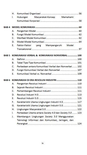 Buku Pengantar Komunikasi dan Aplikasinya dalam Penelitian mengupas konsep-konsep dasar komunikasi untuk memperjelas pemahaman pembaca. Di bab awal, pembaca diperkenalkan pada konsep komunikasi, termasuk definisi dan prosesnya dari perspektif linier, interaksional, dan transaksional. Bab-bab berikutnya membahas sejarah komunikasi dari zaman primitif hingga modern, mencantumkan sumbangan filsuf dalam bidang social science dan natural science. Buku ini juga menyoroti ciri-ciri revolusi industry 4.0 dan era society 5.0, dengan fokus pada lingkungan dan perbedaannya. Penerapan teori komunikasi dalam penelitian, terutama di bab 7 yang membahas model komunikasi korporat pada era revolusi industry 4.0, memberikan contoh konkret tentang bagaimana teori-teori tersebut dapat diterapkan dalam konteks praktis.