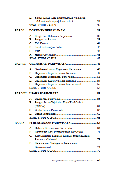 Buku ini mengulas konsep dasar pariwisata, karakteristik destinasi, dinamika pasar wisata, hingga standar layanan yang dibutuhkan di dunia kerja. Pembaca diperkenalkan pada struktur industri pariwisata dengan contoh-contoh nyata yang relevan dengan kebutuhan pendidikan vokasi. Dirancang sebagai sumber belajar yang sistematis dan mudah dipahami, buku ini sangat ideal untuk siswa SMK, mahasiswa vokasi, instruktur, serta siapa pun yang ingin memahami fondasi pariwisata dari perspektif yang lebih praktis dan berorientasi dunia industri.