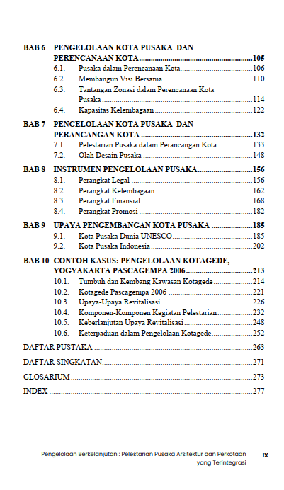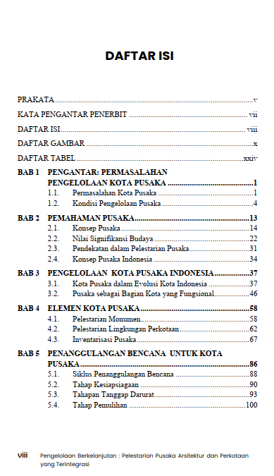 Buku Pengelolaan Berkelanjutan: Pelestarian Pusaka Arsitektur dan Perkotaan yang Terintegrasi hadir sebagai referensi bagi institusi pendidikan tinggi dan organisasi pelestarian dalam menyampaikan materi terkait pengelolaan pusaka. Selain menjadi tantangan, pengelolaan pusaka juga membuka peluang seiring meningkatnya dukungan nasional dan internasional. Hal ini akan mendorong kebutuhan akan tenaga profesional yang memiliki pemahaman mendalam tentang berbagai aspek pusaka. Dengan pengelolaan yang tepat, pusaka kota bukan hanya dilestarikan, tetapi juga dapat menjadi aset yang memperkaya karakter dan daya tarik kota di era modern.