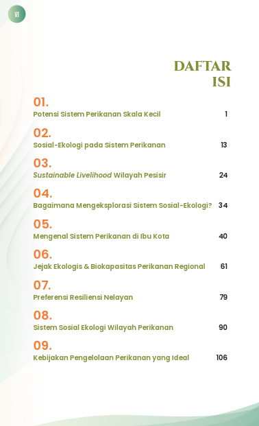 Di sisi sosial, buku ini menggali hubungan erat antara nelayan dan lingkungan pesisir sebagai sebuah sistem terpadu, di mana nelayan sebagai pengguna sumber daya dan ekosistem sebagai penyedia sumber daya saling memengaruhi. Perlindungan terhadap nelayan, yang merupakan bagian penting dari sistem ini, menjadi salah satu perhatian utama, mengingat ketergantungan mereka pada sumber daya perikanan yang semakin tertekan oleh perubahan ekologi. Melalui eksplorasi mendalam, buku ini menyajikan peta interaksi antara aspek sosial dan ekologi. Dengan begitu, buku ini diharapkan menjadi panduan strategis bagi pembaca, baik praktisi, akademisi, maupun pembuat kebijakan, untuk memahami dinamika sosial-ekologis sekaligus mengarahkan upaya pengelolaan perikanan menuju keberlanjutan.