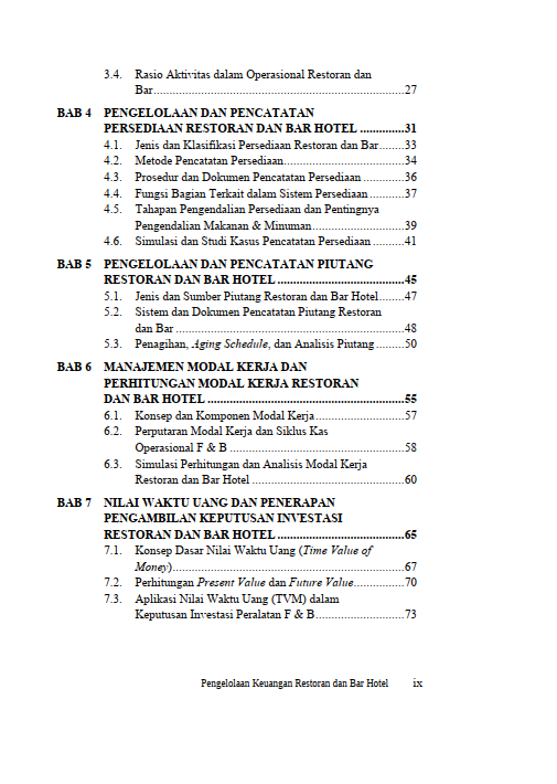 Dirancang untuk mahasiswa vokasi, dosen, dan praktisi industri F&B hotel, buku ini juga dapat menjadi referensi lintas disiplin bagi mahasiswa pariwisata, akuntansi, serta profesional yang ingin memperdalam aspek finansial dalam dunia hospitality.