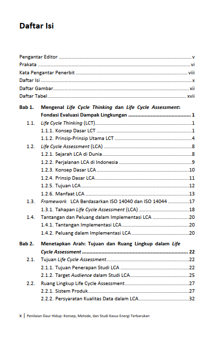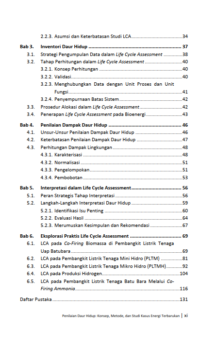 Dalam menghadapi tantangan lingkungan global yang terus berkembang, kebutuhan akan sistem produksi yang berkelanjutan serta metode penilaian dampak yang komprehensif menjadi semakin mendesak. Perubahan iklim, kelangkaan sumber daya, dan tekanan terhadap ekosistem menuntut adanya sebuah pendekatan yang lebih holistik dan berbasis data untuk mengukur jejak aktivitas manusia. Buku Penilaian Daur Hidup: Konsep, Metode, dan Studi Kasus Energi Terbarukan ini hadir sebagai jawaban atas kebutuhan tersebut, dengan memperkenalkan sebuah langkah-langkah untuk mengevaluasi dampak lingkungan secara menyeluruh. Pembaca akan diajak memahami konsep fundamental LCA sebagai pembahasan tentang “dari buaian hingga liang lahat” (cradle-to-grave), yang secara terstruktur menguantifikasi berbagai dampak potensial, mulai dari jejak karbon, penggunaan air, hingga toksisitas terhadap ekosistem. Buku ini memosisikan LCA bukan sekadar alat, melainkan sebagai sebuah cara pandang baru dalam melihat siklus hidup produk dan layanan.