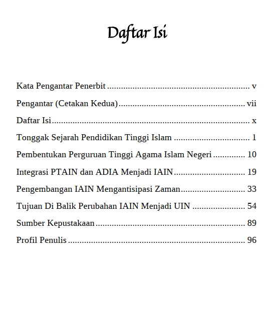 Dalam buku ini M. Fuad Nasar sebagai seorang peminat sejarah mengelaborasi pengetahuan dan hasil penguraian tentang sejarah Perguruan Tinggi Keagamaan Islam Negeri di negara kita, dinamika perkembangan dan kemajuan yang dicapai hingga saat ini. Juga diungkapkan cita-cita dan pesan para pendahulu yang menginginkan lembaga pendidikan tinggi Islam menjadi institusi yang melahirkan ulama intelek dan intelek yang ulama serta kader-kader pemimpin di berbagai bidang. Sejak tonggak sejarah pendidikan tinggi Islam di Indonesia diletakkan, cita-cita luhur para pendahulu terus bergema, yaitu mewujudkan institusi yang mampu mencetak ulama yang berintelektual tinggi dan intelektual yang memiliki kedalaman ilmu agama, serta melahirkan kader-kader pemimpin cakap di berbagai sektor. Perjalanan panjang pembentukan Perguruan Tinggi Agama Islam Negeri (PTAIN) hingga integrasinya dengan Akademi Dinas Ilmu Agama (ADIA) menjadi Institut Agama Islam Negeri (IAIN) merupakan fase penting dalam mengantisipasi tuntutan zaman. Pengembangan IAIN yang berkelanjutan, hingga bertransformasi menjadi Universitas Islam Negeri (UIN), adalah wujud nyata dari upaya mencapai tujuan mulia tersebut, seiring dengan dinamika perkembangan dan kemajuan yang telah dicapai hingga saat ini.