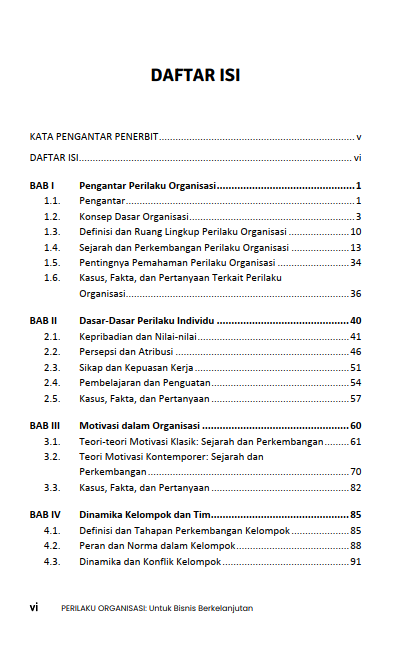 Buku Perilaku Organisasi: Untuk Bisnis Berkelanjutan ini mengupas konsep dan penerapan perilaku organisasi, yang mencakup dasar perilaku individu, dinamika kelompok, hingga tren masa depan yang memengaruhi organisasi. Dengan disusun secara sistematis, berbagai aspek penting, termasuk kepemimpinan, motivasi, pengambilan keputusan, budaya organisasi, komunikasi, dan pengelolaan konflik dijabarkan secara tuntas. Disertai Teori Klasik dan Kontemporer, karya ini mengintegrasikan wawasan teoretis dengan penerapan praktis agar pembaca secara efektif dapat memahami dan mengelola dinamika organisasi.