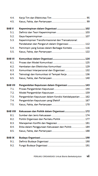Pembahasan lebih mendalamnya, antara lain dengan mengaitkan perilaku organisasi dengan konsep keberlanjutan bisnis, kolaborasi antarorganisasi, prinsip Triple Bottom Line, pelaporan keberlanjutan, dan teknologi hijau. Pada bab-bab terakhir penulis mencoba memberikan panduan untuk mengintegrasikan sejumlah nilai keberlanjutan ke dalam kegiatan operasional dan strategi organisasi. Dengan berbasis kombinasi teori, fakta, kasus, dan pertanyaan reflektif, buku ini bisa menjadi referensi signifikan bagi mahasiswa khususnya dan kalangan lain yang ingin membangun organisasi yang adaptif, inovatif, dan berkelanjutan.