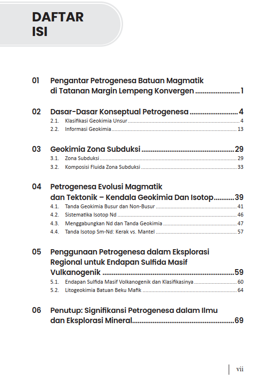 Setiap batuan di perut bumi menyimpan sebuah cerita epik tentang kelahirannya, sebuah proses yang dikenal sebagai petrogenesa. Kisah ini terungkap melalui “sidik jari” kimiawi yang terkandung di dalamnya, yaitu berbagai jenis unsur dan isotop. Buku ini hadir sebagai referensi untuk membaca cerita tersebut, mengajak Anda menyelami dunia geokimia untuk memahami asal-usul dan evolusi batuan. Pembahasan diawali dengan memperkenalkan para “aktor” utamanya: berbagai klasifikasi unsur kimia yang berperan dalam pembentukan batuan. Anda akan belajar membedakan jejak-jejak yang ditinggalkan oleh unsur utama, unsur jejak seperti tanah jarang, hingga isotop radiogenik yang berfungsi layaknya jam geologis untuk melacak perjalanan magma dari dalam bumi. Dengan bekal pemahaman dasar tersebut, buku ini kemudian membawa Anda ke salah satu “panggung” geologi paling dinamis di planet ini: zona subduksi, tempat lempeng samudra menunjam ke bawah benua dan melahirkan magma. Di sini, Anda akan belajar bagaimana membedakan tanda-tanda geokimia dan isotopik unik yang mencirikan batuan vulkanik dari berbagai latar tektonik, seperti busur vulkanik dan nonbusur. Puncaknya, buku ini tidak hanya berhenti pada teori. Pengetahuan mendalam tentang petrogenesa ini akan diaplikasikan sebagai alat yang sangat kuat dalam dunia nyata, yaitu sebagai referensi dalam eksplorasi regional untuk menargetkan dan menemukan endapan mineral berharga, khususnya endapan sulfida masif volkanogenik (VMS) yang bernilai ekonomis tinggi