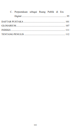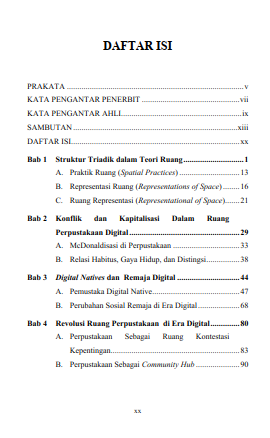 Buku ini mengupas tentang ruang sebagai arena aktivitas sosial, salah satunya adalah ruang perpustakaan. Ruang perpustakaan yang berfungsi sebagai sarana untuk melaksanakan kekuasaan dan kontrol. Ruang perpustakaan bisa menjadi arena untuk menjelaskan bagaimana representasi ruang perpustakaan tersebut sebagai ruang publik. Mengalirnya informasi yang begitu cepat dan masif melalui berbagai media, membuat pemustaka digital natives semakin mudah untuk memenuhi kebutuhan informasi. Generasi pemustaka saat ini merupakan generasi internet karena mereka lebih memilih pencarian informasi melalui mesin pencari sebagai tujuan utama saat akses informasi di ruang perpustakaan.