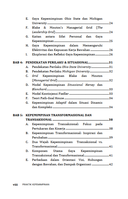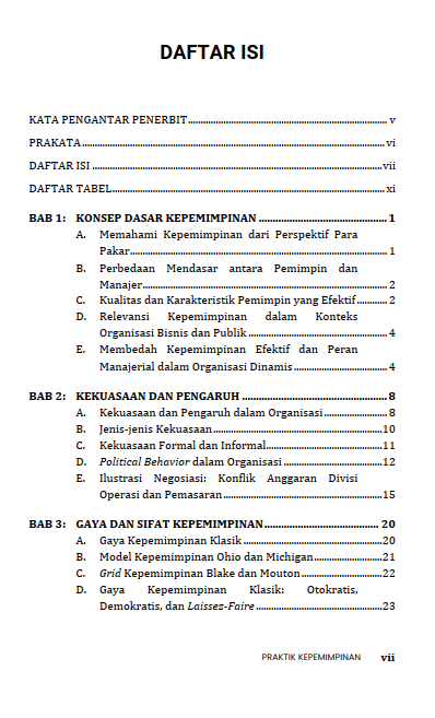 Buku ini disusun sebagai referensi bagi pembaca dalam memahami dan melaksanakan sebuah kepemimpinan yang lebih efektif dalam lingkup akademik, organisasi, maupun di masyarakat. Materi di dalamnya meliputi konsep dasar dan teori kepemimpinan, hingga karakteristik serta gaya kepemimpinan yang bisa dipelajari. Selanjutnya, pembaca diajak memahami lebih jauh mengenai peran pemimpin dalam kelompok, kemudian masuk pada bagian inti, yaitu praktik kepemimpinan di lapangan. Buku ini juga dilengkapi dengan contoh peristiwa, refleksi, serta evaluasi diri yang membantu mahasiswa mengukur sekaligus meningkatkan kemampuan kepemimpinan mereka.
