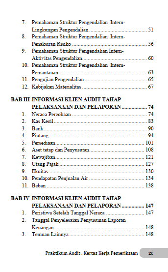 Buku Praktikum Audit: Kertas Kerja Pemeriksaan ini disusun khusus untuk membantu mahasiswa memahami teknik pembuatan Kertas Kerja Pemeriksaan (KKP) dalam konteks audit, dengan fokus pada objek perusahaan air minum. Dalam buku ini, pembaca akan dibimbing melalui penggunaan Aplikasi ATLAS, sebuah aplikasi berbasis online dan Excel yang diterbitkan oleh Pusat Pembinaan Profesi Keuangan (PPPK) Kementerian Keuangan.