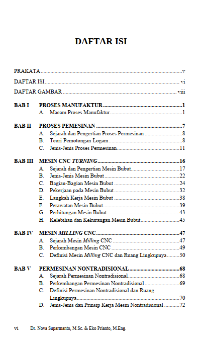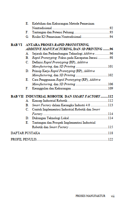 Buku Proses Manufaktur ini disusun guna menjelaskan dan mengeksplorasi peran penting teknologi permesinan dalam pengembangan produk modern. Terbagi ke dalam lima bab, buku ini mengulas mulai dari sejarah proses permesinan, mesin CNC turning, mesin milling CNC, proses pemesinan non-tradisional, proses rapid prototyping/additive manufacturing/3D printing, prinsip kerjanya, keuntungan, hingga aplikasinya. Dalam buku ini juga dibahas masalah yang dihadapi saat menggunakan teknologi ini, serta tren masa depan.
