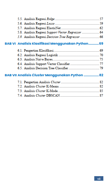 Buku ini memandu Anda secara sistematis, mulai dari fondasi statistik dasar seperti ukuran pemusatan dan penyebaran, hingga teknik lanjutan yang merupakan inti dari Data Science modern. Kuasai Uji Hipotesis, selami berbagai jenis Analisis Regresi (Linear, Lasso, Ridge, hingga Decision Tree Regressor), dan terapkan Analisis Klasifikasi (Regresi Logistik, Naive Bayes) dan Analisis Cluster (K-Means, DBSCAN). Setiap bab dilengkapi dengan implementasi Python yang jelas dan studi kasus yang relevan. Jika Anda seorang akademisi, peneliti, atau praktisi data yang ingin meningkatkan kemampuan analisis data secara efektif dan modern, buku dari Deepublish ini adalah panduan yang wajib Anda miliki.
