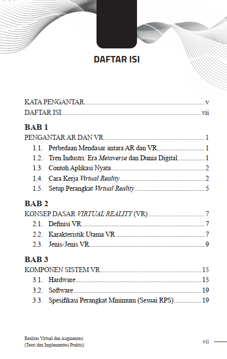 Buku ini menyajikan panduan mengenai teori Realitas Virtual dan Augmentasi Implementasi Praktis. Di dalamnya dibahas konsep teknologi, hingga implementasi virtual reality dan augmented reality. Materi ini disusun mulai dari pengantar, dasar teori, hingga praktik langsung bagaimana pengembangan aplikasi VR. Bab awal menjelaskan perbedaan mendasar AR dan VR serta contoh aplikasi nyata di berbagai bidang. Pembahasan dilanjutkan dengan komponen sistem VR, mulai dari perangkat keras (HMD, controller, tracking) hingga perangkat lunak (Unity, Unreal Engine, SDK).