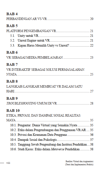 Buku ini juga menjelaskan perbandingan AR dan VR, serta panduan pengembangan aplikasi menggunakan Unity maupun Unreal Engine sesuai kebutuhan proyek. Selain itu, buku ini menghadirkan studi kasus media pembelajaran, proyek interaktif, langkah praktis membuat VR sederhana, serta troubleshooting masalah umum. Dengan penyajian teoretis dan praktis, buku ini menjadi referensi ideal bagi mahasiswa, dosen, maupun pengembang yang ingin memahami sekaligus menerapkan VR dan AR secara komprehensif.