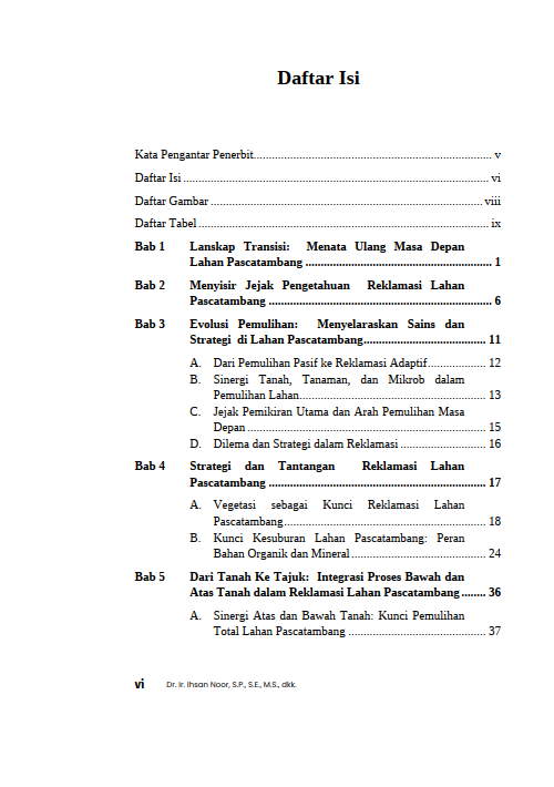 Buku ini mengulas reklamasi lahan pascatambang sebagai proses pemulihan ekologis yang kompleks, bukan sekadar penanaman ulang atau penataan permukaan lahan. Dengan menautkan dinamika tanah, vegetasi, mikrob, serta konteks sosial dan kebijakan, buku ini menyajikan gambaran utuh tentang bagaimana lanskap terdegradasi dapat dipulihkan secara fungsional dan berkelanjutan. Pembahasan difokuskan pada strategi perbaikan tanah berbasis amandemen organik, pemilihan vegetasi yang adaptif, serta strategi terpadu yang menggabungkan intervensi fisik, kimia, dan biologis. Disusun dengan alur yang runtut, buku ini menawarkan pijakan konseptual dan praktis bagi siapa pun yang ingin memahami reklamasi pascatambang sebagai upaya pemulihan ekosistem jangka panjang, bukan solusi instan yang dangkal.