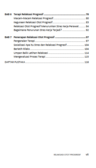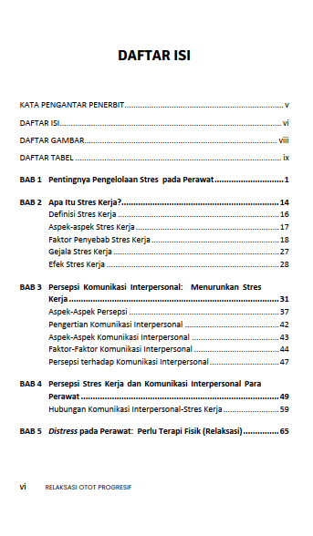 Mengupas secara mendalam potensi stres yang dihadapi perawat, buku ini menyoroti pentingnya komunikasi personal sebagai langkah awal untuk memahami dan menurunkan tingkat stres. Dalam kondisi distress yang berat, langkah tambahan berupa penanganan fisik menjadi kebutuhan mendesak. Namun, sebagai upaya preventif dan rehabilitatif, relaksasi otot progresif menjadi pilihan terapi yang terbukti efektif. Penulis tidak hanya menjelaskan teori di balik teknik relaksasi otot progresif, tetapi juga menyajikan langkah demi langkah untuk penerapannya dalam beberapa sesi terapi yang terstruktur.